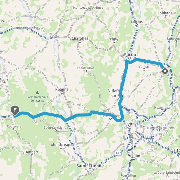 Continuer et rejoindre A89 E70. Continuer sur 44 kilomètres