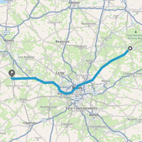 Prendre à gauche et rejoindre A13 E5. Continuer sur 20 kilomètres
