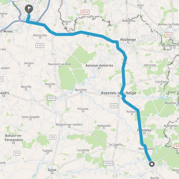 Au rond-point, prendre la 2ème sortie sur D649 (Route de Valenciennes) et continuer sur 28 kilomètres