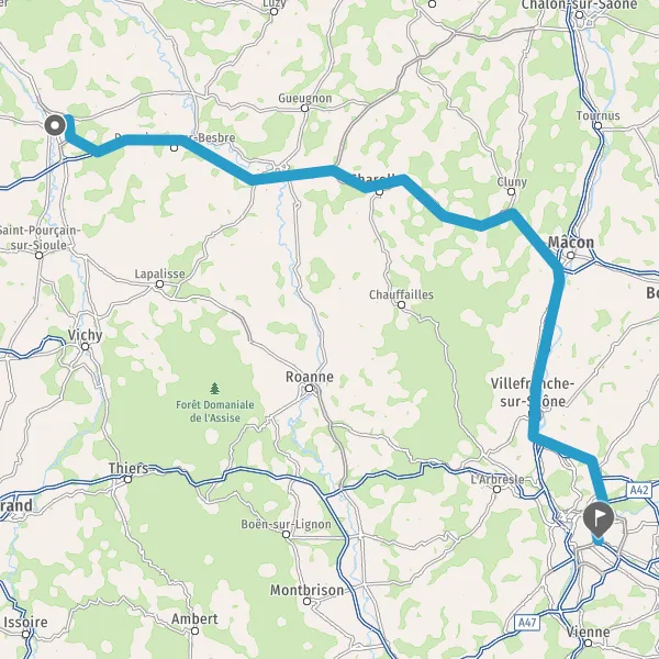 Prendre à droite et rejoindre A79 E62. Continuer sur 45 kilomètres