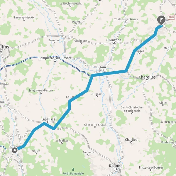 Tourner légèrement à gauche sur D906b (Route de Lapalisse) et continuer sur 10 kilomètres