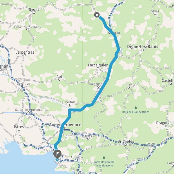 Avec le mode voiture, vous pouvez configurer vos options (type de véhicule, autoroute ou non, péage ou non, distance la plus courte), tout en ayant accès aux infos de circulation grâce à notre service d'info-trafic en temps réel. Ainsi faites des économies sur le coût ou la durée de votre voyage, en trouvant le trajet Eyguians Marseille adapté à vos besoins.