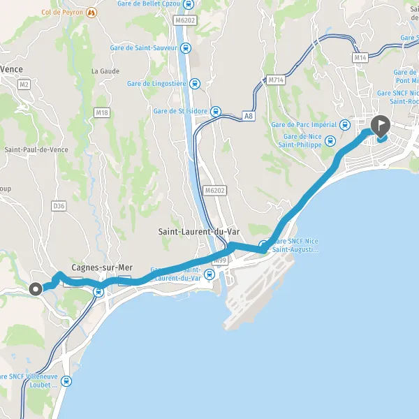 Avec le mode voiture, vous pouvez configurer vos options (type de véhicule, autoroute ou non, péage ou non, distance la plus courte), tout en ayant accès aux infos de circulation grâce à notre service d'info-trafic en temps réel. Ainsi faites des économies sur le coût ou la durée de votre voyage, en trouvant le trajet Villeneuve-Loubet Nice adapté à vos besoins.