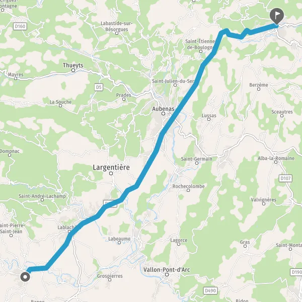 Au rond-point, prendre la 2ème sortie sur D104 (Route d'Aubenas) et continuer sur 4,4 kilomètres
