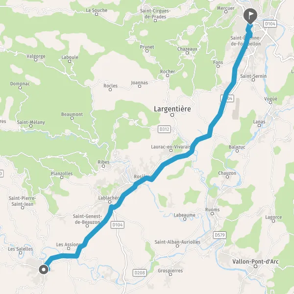 Au rond-point, prendre la 2ème sortie sur D104 (Route d'Aubenas) et continuer sur 4,4 kilomètres