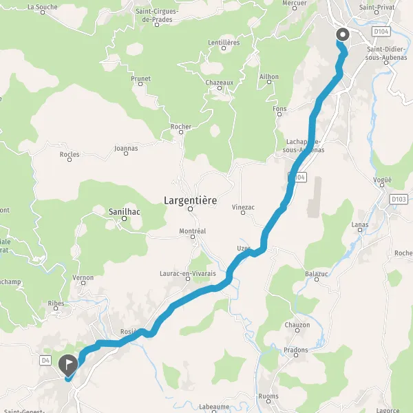Au rond-point, prendre la 2ème sortie sur D104 (Route d'Aubenas) et continuer sur 1,8 kilomètre