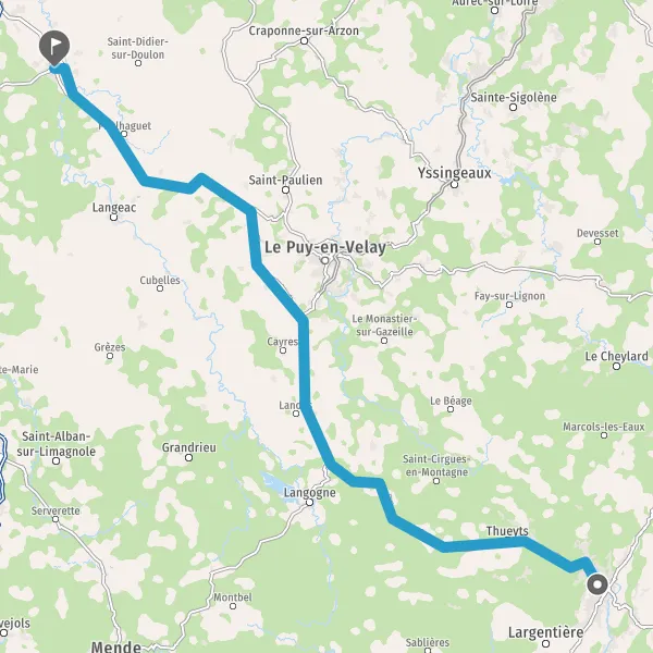 Tourner légèrement à gauche sur N102 (Route du Puy-en-Velay) et continuer sur 15 kilomètres