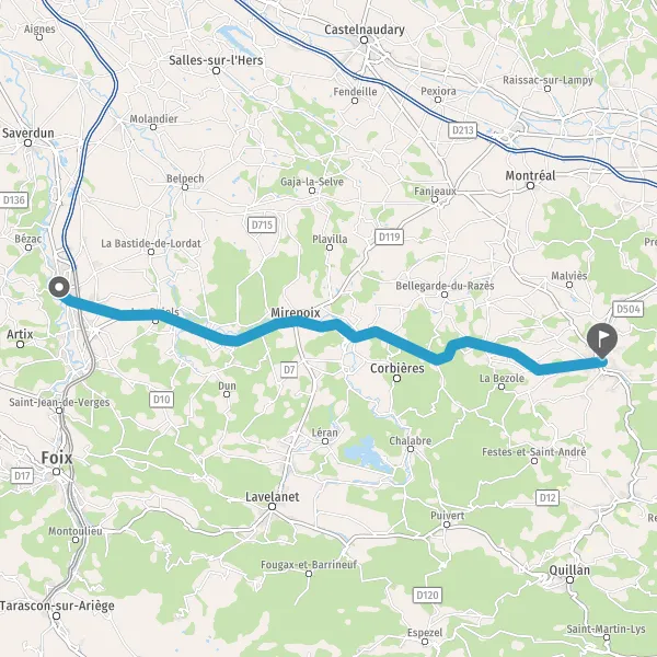 Au rond-point, prendre la 2ème sortie sur D119 (Route de Mirepoix) et continuer sur 18 kilomètres