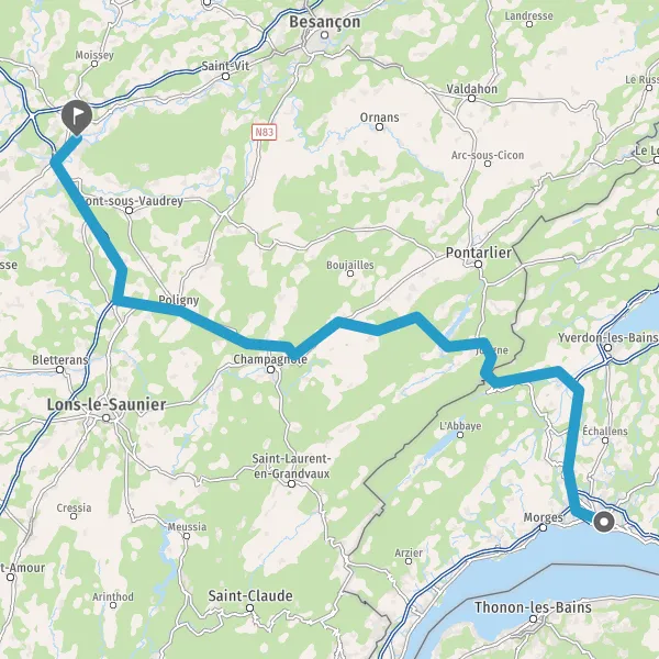 Entrer en France et prendre N57 E23 (Route de Vallorbe) sur 4,9 kilomètres