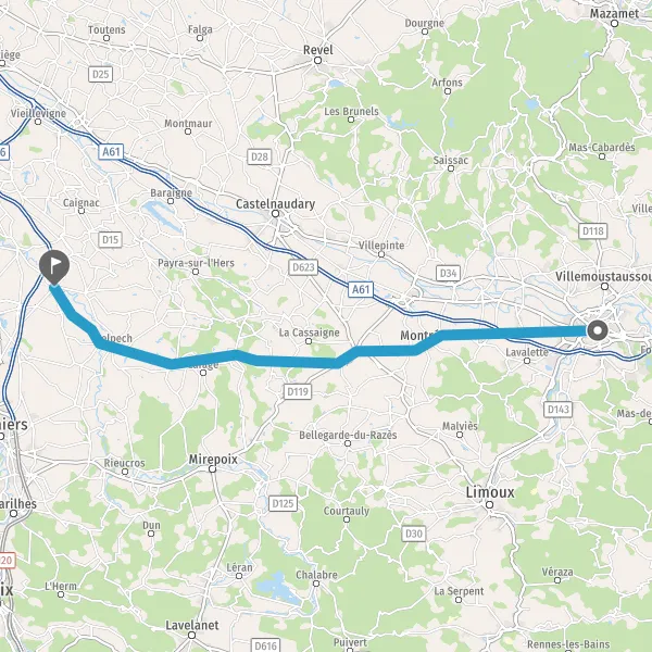 Tourner légèrement à gauche sur D102 (Route de Belpech) et continuer sur 17 kilomètres