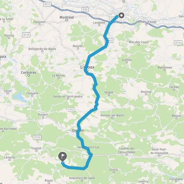 Au rond-point, prendre la 2ème sortie sur D118 (Route de Limoux) et continuer sur 7,4 kilomètres