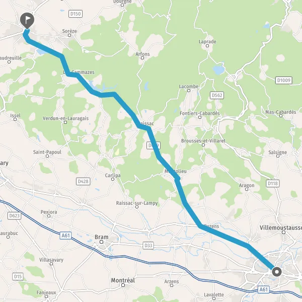 Tourner légèrement à droite sur D629 (Route de Carcassonne) et continuer sur 9,4 kilomètres