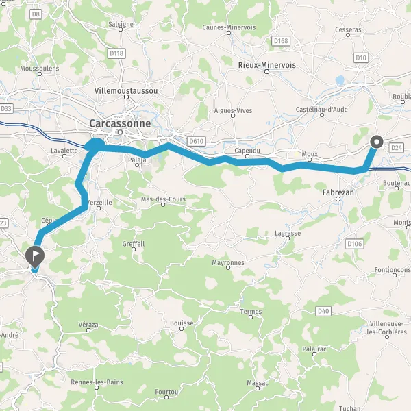 Au rond-point, prendre la 2ème sortie sur D6113 (Route de Carcassonne) et continuer sur 5,3 kilomètres
