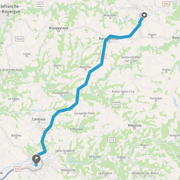 Au rond-point, prendre la 3ème sortie sur N88 (Route d'Albi) et continuer sur 2,1 kilomètres