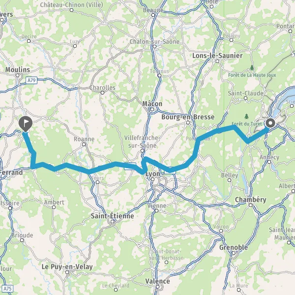 Continuer et rejoindre A89 E70. Continuer sur 55 kilomètres