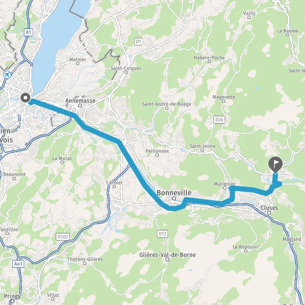 Prendre à gauche et rejoindre D1205 (Route de Cluses). Continuer sur 40 mètres