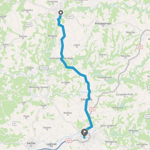 Au rond-point, prendre la 2ème sortie sur N88 (Route d'Albi) et continuer sur 2,1 kilomètres