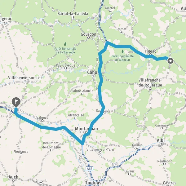 Prendre à droite et rejoindre A62 E72. Continuer sur 67 kilomètres