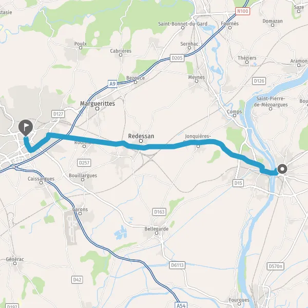 Au rond-point, prendre la 3ème sortie sur D999 (Route de Nîmes) et continuer sur 3,9 kilomètres