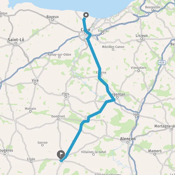 Au rond-point, prendre la 3ème sortie sur N158 (Route de Falaise) et continuer sur 28 kilomètres