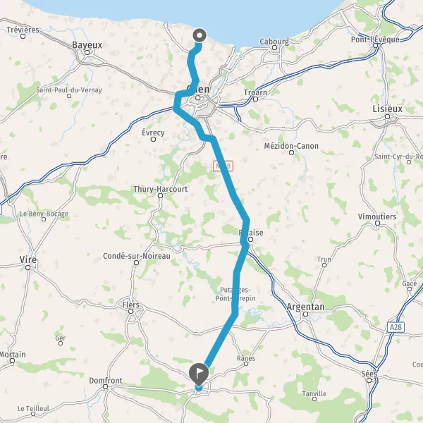 Au rond-point, prendre la 3ème sortie sur N158 (Route de Falaise) et continuer sur 28 kilomètres