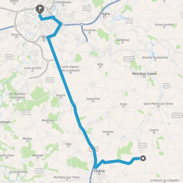 Au rond-point, prendre la 2ème sortie sur N158 (Route de Falaise) et continuer sur 3,1 kilomètres