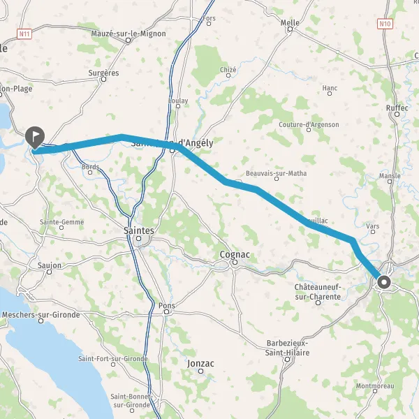 Au rond-point, prendre la 3ème sortie sur D939 (Route de Saint-Jean-d'Angély) et continuer sur 14 kilomètres