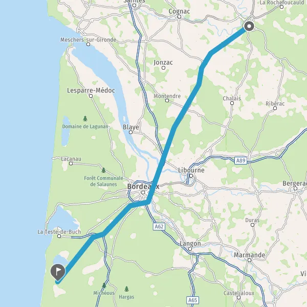 Prendre à droite et rejoindre A63. Continuer sur 25 kilomètres