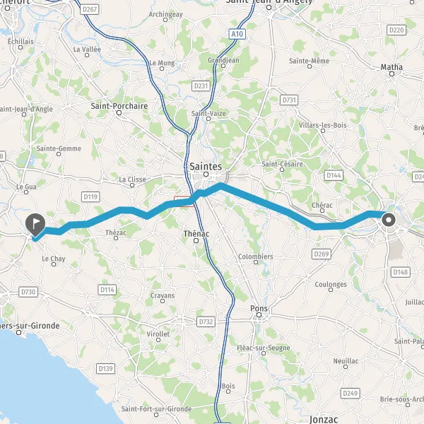Tourner à gauche sur D83 (Route Basse de Saintes) et continuer sur 11 kilomètres