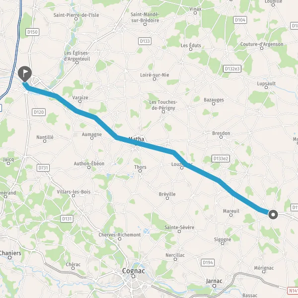 Tourner à gauche sur D939 (Route de Saint-Jean-d'Angély) et continuer sur 21 kilomètres