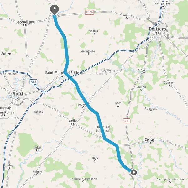 Tourner légèrement à droite sur D45 (Route de la Mothe Saint-Héray) et continuer sur 7,1 kilomètres