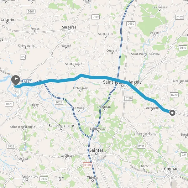Au rond-point, prendre la 3ème sortie sur D939 (Route de Saint-Jean-d'Angély) et continuer sur 14 kilomètres