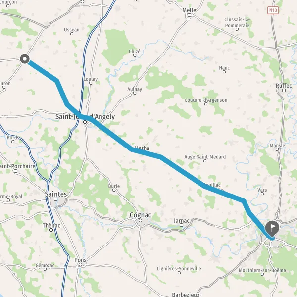 Au rond-point, prendre la 1ère sortie sur D939 (Rue de Saint-Jean-d'Angély) et continuer sur 1,6 kilomètre