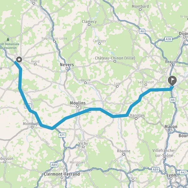 Payer 10,50 € (Péage Deux chaises) Prendre un ticket (Péage Le Montet Ouest) Payer 1,00 € (Péage Le Montet Est) Prendre un ticket (Péage Montbeugny Ouest) Payer 1,90 € (Péage Montbeugny Est) Prendre un ticket (Péage Molinet Ouest) Payer 1,30 € (Péage Molinet Est) 117 km