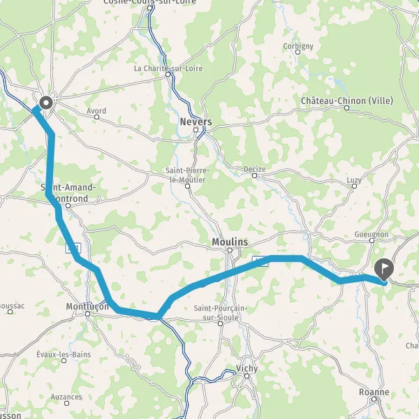 Payer 10,50 € (Péage Deux chaises) Prendre un ticket (Péage Le Montet Ouest) Payer 1,00 € (Péage Le Montet Est) Prendre un ticket (Péage Montbeugny Ouest) Payer 1,90 € (Péage Montbeugny Est) Prendre un ticket (Péage Molinet Ouest) Payer 1,30 € (Péage Molinet Est) 116 km