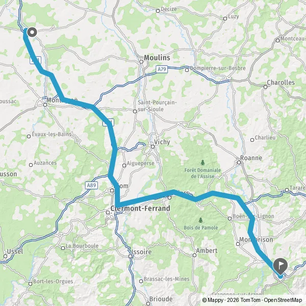 Prendre à droite et rejoindre A89 E70. Continuer sur 84 kilomètres