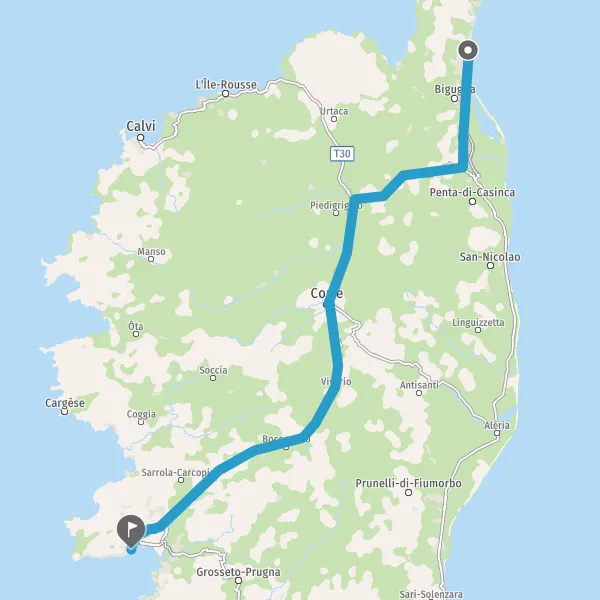 Tourner légèrement à droite sur T20 (Carrughju Anziana Gendarmeria) et continuer sur 14 kilomètres