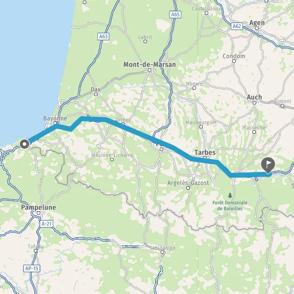 Prendre à droite et rejoindre A64 E80. Continuer sur 205 kilomètres