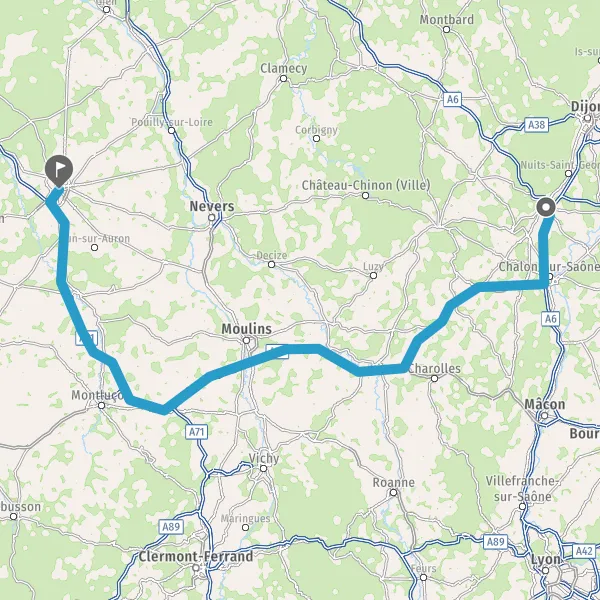 Prendre un ticket (Péage Molinet Est) Payer 1,30 € (Péage Molinet Ouest) Prendre un ticket (Péage Montbeugny Est) Payer 1,90 € (Péage Montbeugny Ouest) Prendre un ticket (Péage Le Montet Est) Payer 1,00 € (Péage Le Montet Ouest) Prendre un ticket (Péage Deux chaises) 61 km