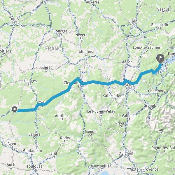 Prendre à droite et rejoindre A89 E70. Continuer sur 69 kilomètres