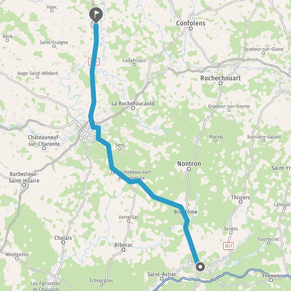 Au rond-point, prendre la 2ème sortie sur D939 (Route de Périgueux) et continuer sur 14 kilomètres