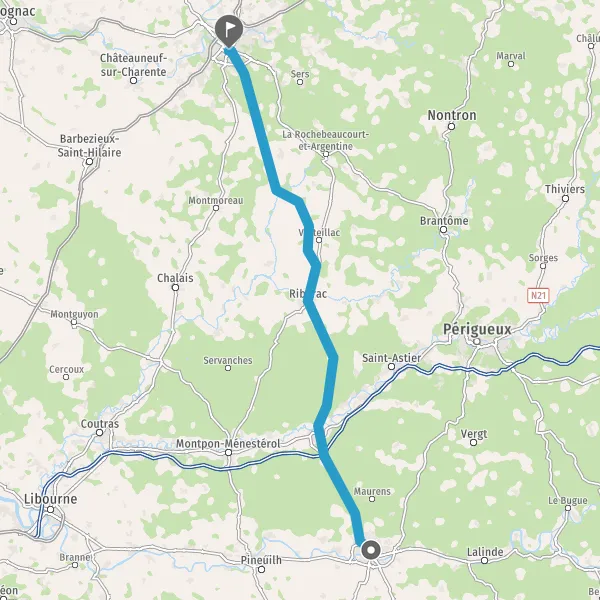 Au rond-point, prendre la 2ème sortie sur D709 (Route de Riberac) et continuer sur 10 kilomètres