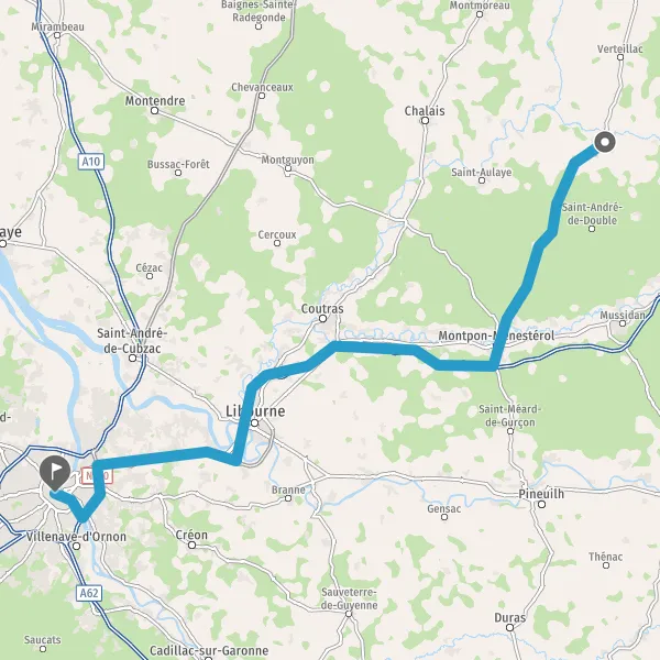 Tourner légèrement à droite sur D708 (Route Nationale de Ribélac à Sainte-Foy-la-Grande) et continuer sur 7,5 kilomètres