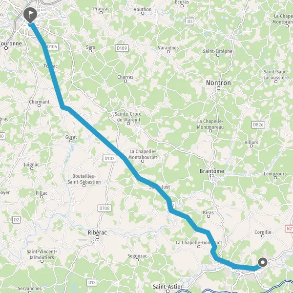 Tourner légèrement à droite sur D2 (Saint-Vivien Ouest) et continuer sur 8,7 kilomètres