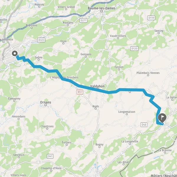 Tourner légèrement à droite sur N57 E23 (Faubourg Rivotte) et continuer sur 17 kilomètres