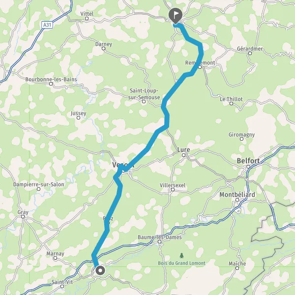 Prendre à droite et rejoindre N57 E23 (Rue de Vesoul). Continuer sur 32 kilomètres