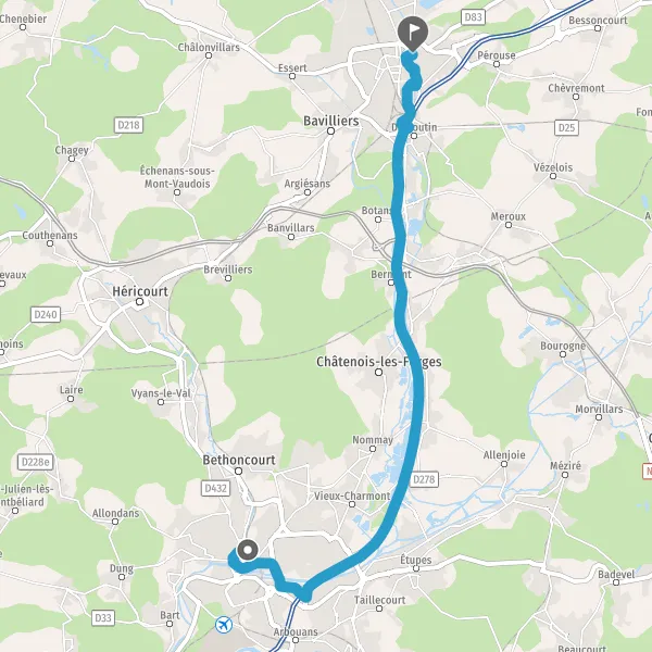 Prendre à droite et rejoindre A36 E60. Continuer sur 12 kilomètres