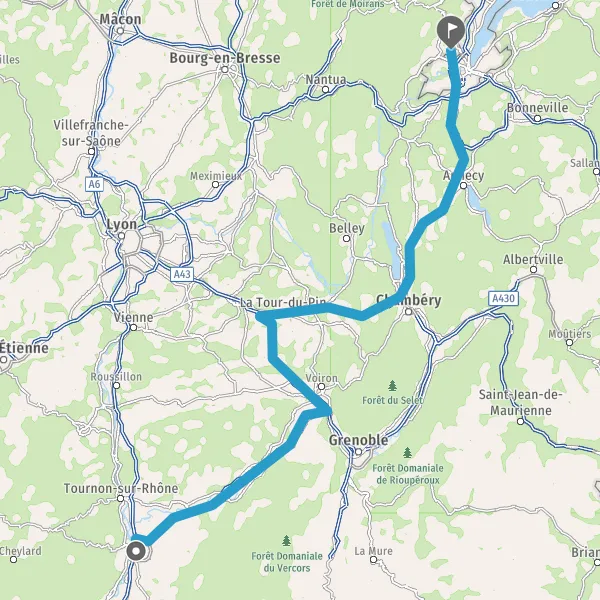 Prendre à droite et rejoindre A43 E70. Continuer sur 47 kilomètres
