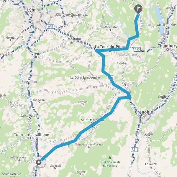 Prendre à droite et rejoindre A43 E70. Continuer sur 25 kilomètres