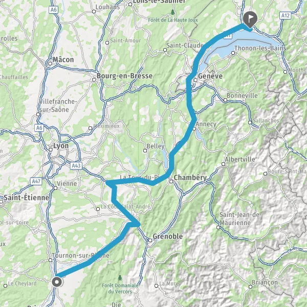 Prendre à droite et rejoindre A43 E70. Continuer sur 47 kilomètres